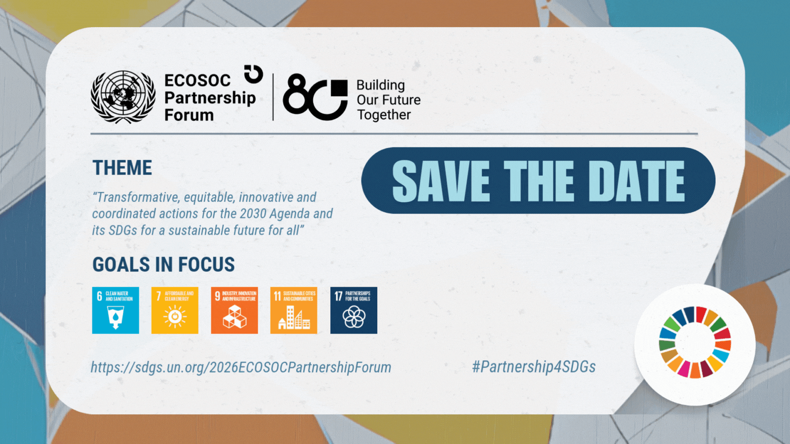 The 2026 Partnership Forum of the Economic and Social Council (ECOSOC) will take place on 27 January 2026 at the UN Headquarters in New York under the theme “Transformative, equitable, innovative and coordinated actions for the 2030 Agenda and its SDGs for a sustainable future for all”. The Forum will place a special emphasis on the Sustainable Development Goals under in-depth review at the 2026 high-level political forum on sustainable development (HLPF), namely Goal 6 (Clean Water and Sanitation), Goal 7 (Affordable and Clean Energy), Goal 9 (Industry Innovation and Infrastructure), Goal 11 (Sustainable Cities and Communities), and Goal 17 (Partnerships for the Goals).